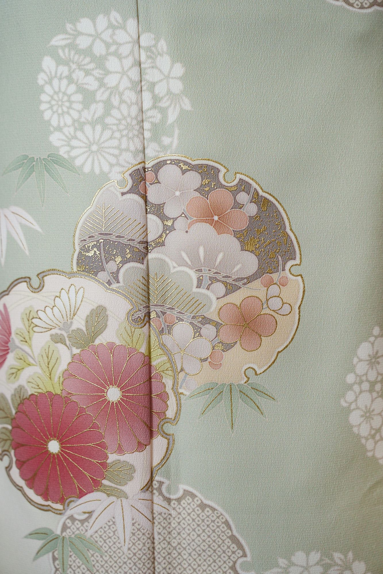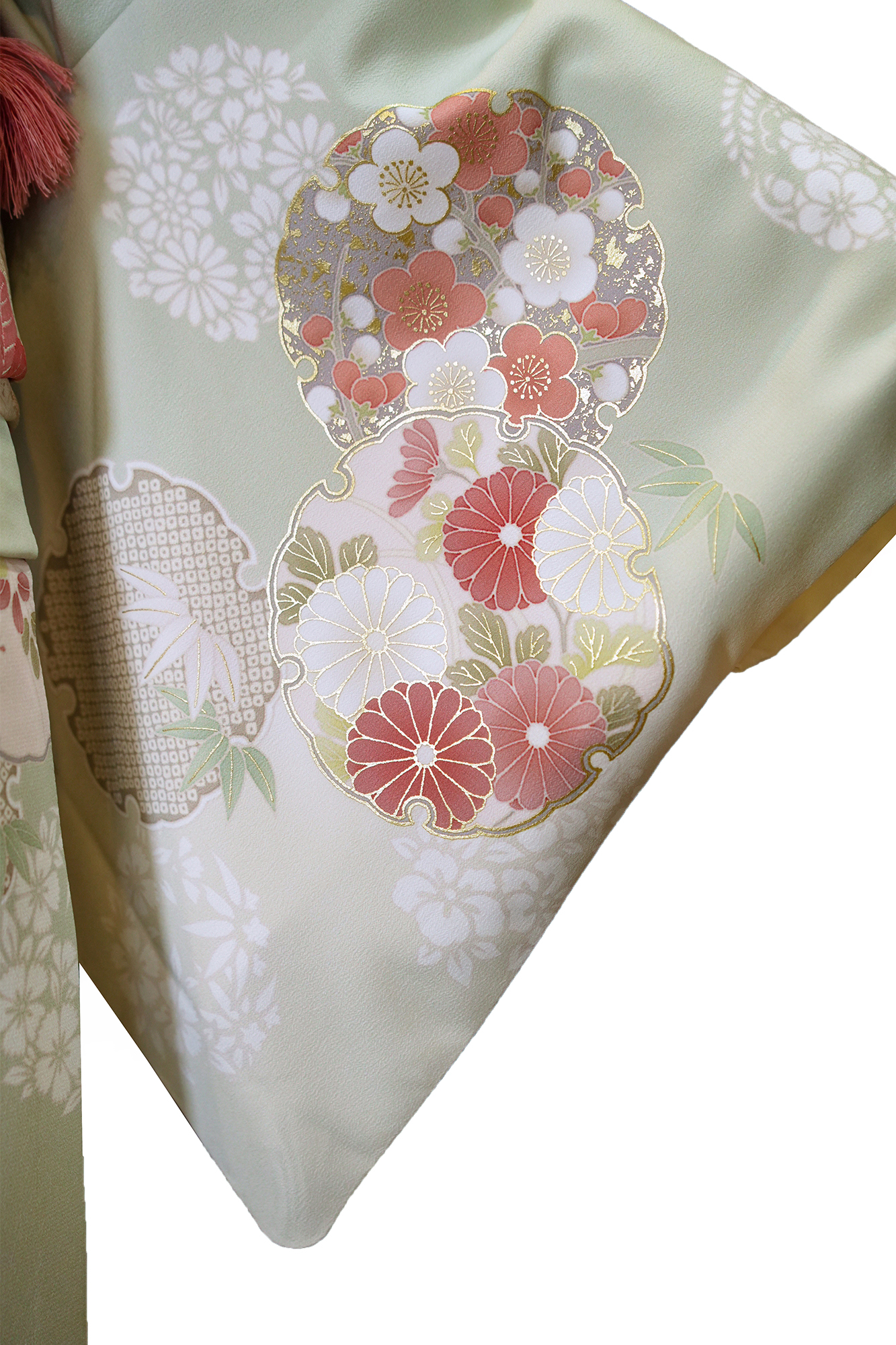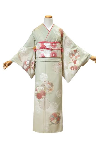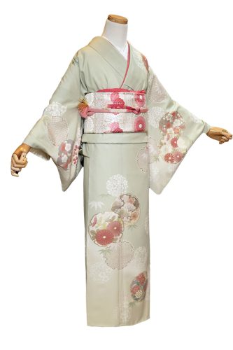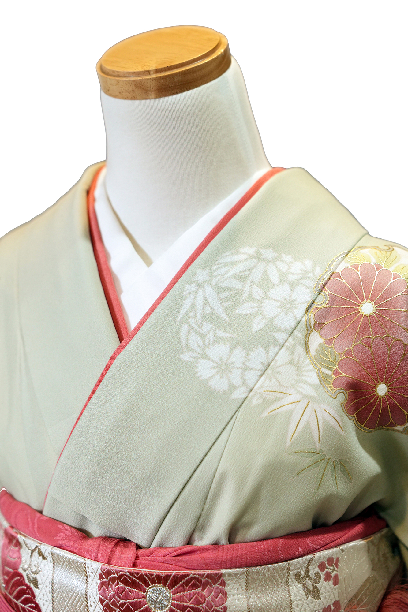 The outfit is paired with a Fukuro obi (袋帯) tied in the taiko style (太鼓結び) – a balanced square symbolizing formality and elegance. When worn, Houmongi brings a sense of luxury and nobility.