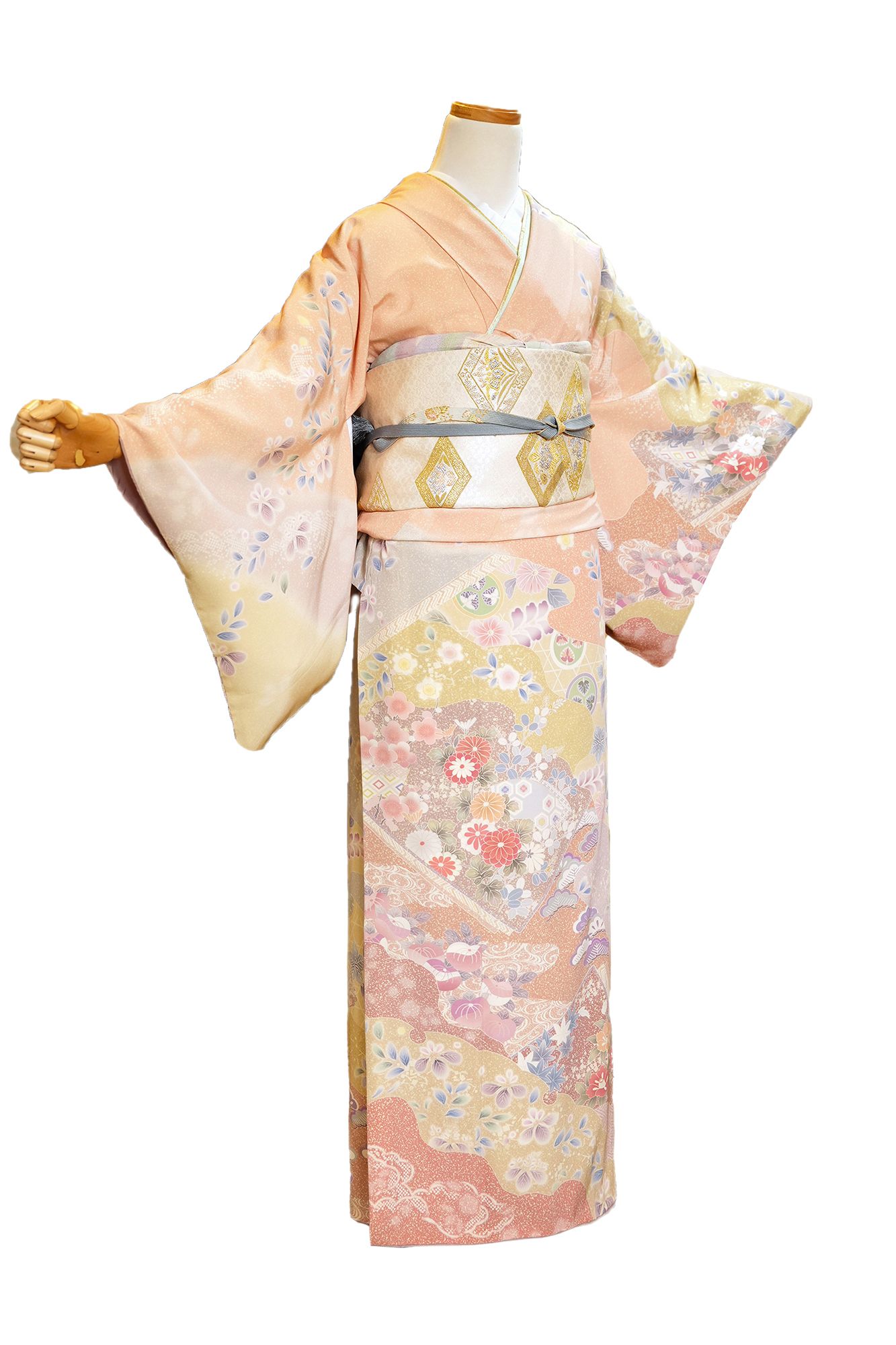 The outfit is paired with a Fukuro obi (袋帯) tied in the taiko style (太鼓結び) – a balanced square symbolizing formality and elegance. When worn, Houmongi brings a sense of luxury and nobility.