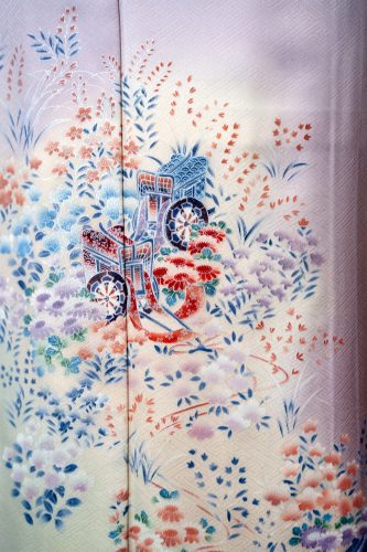The outfit is paired with a Fukuro obi (袋帯) tied in the taiko style (太鼓結び) – a balanced square symbolizing formality and elegance. When worn, Houmongi brings a sense of luxury and nobility.