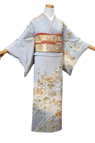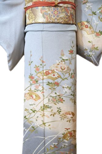 The outfit is paired with a Fukuro obi (袋帯) tied in the taiko style (太鼓結び) – a balanced square symbolizing formality and elegance. When worn, Houmongi brings a sense of luxury and nobility.