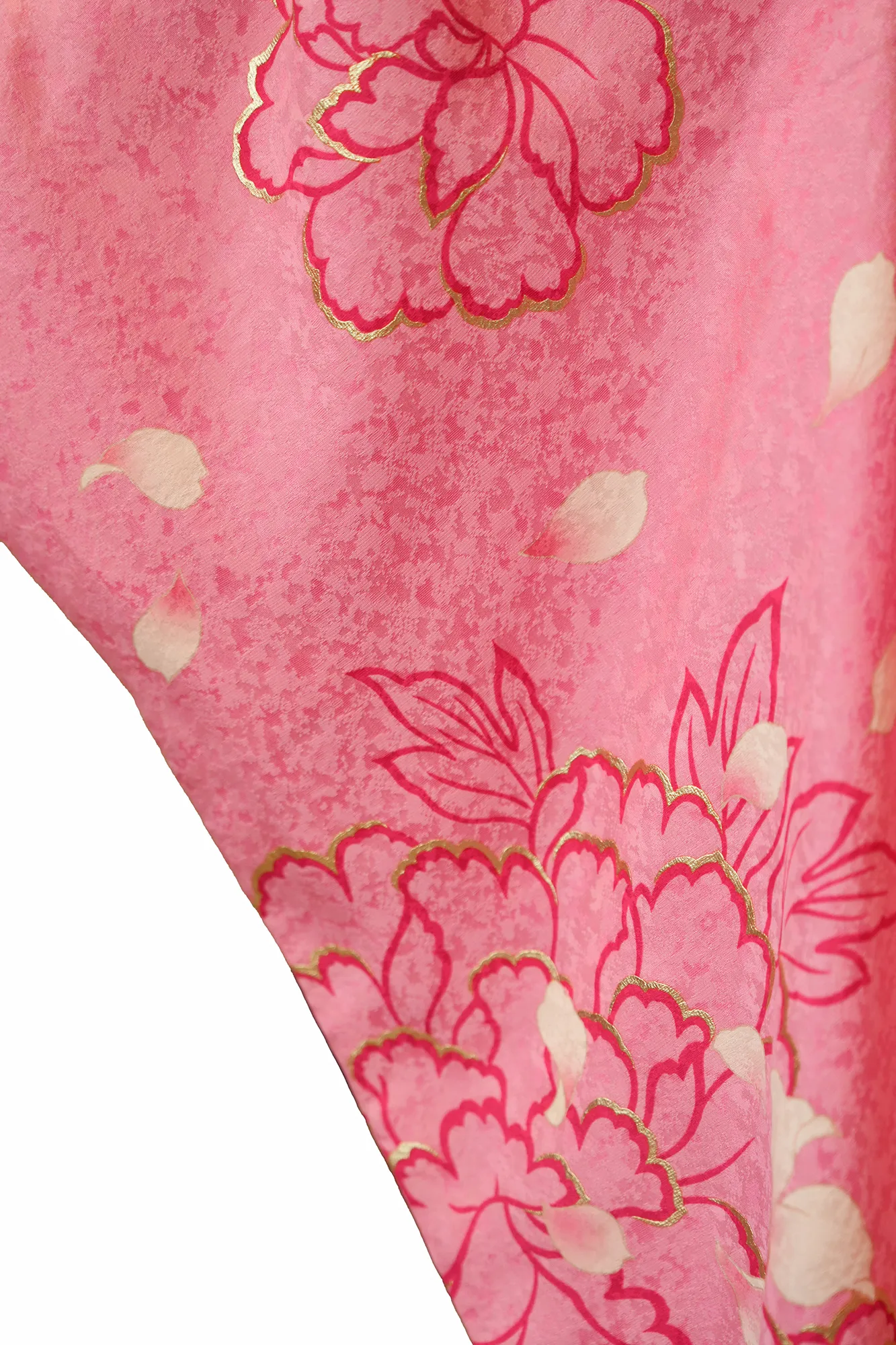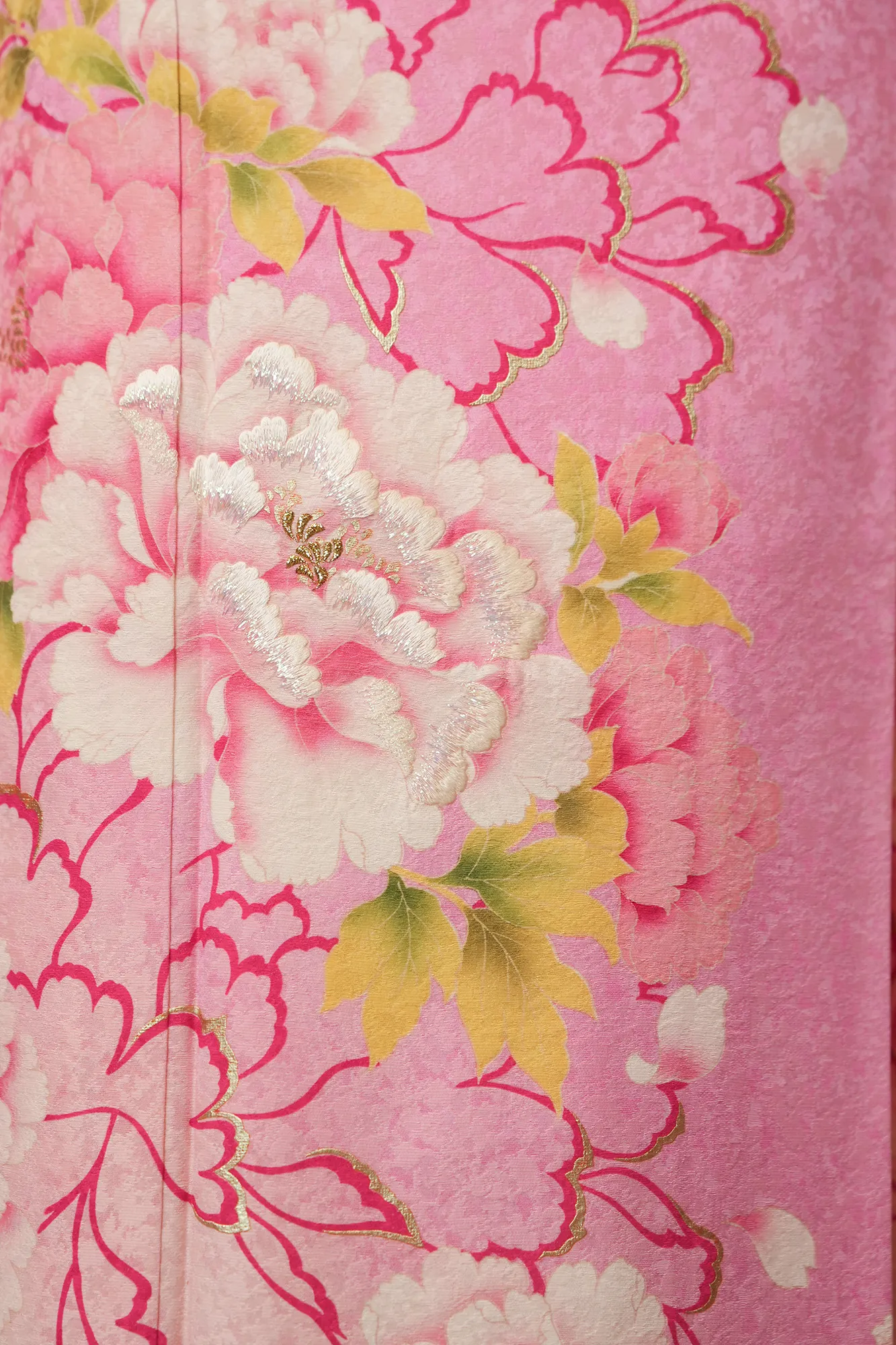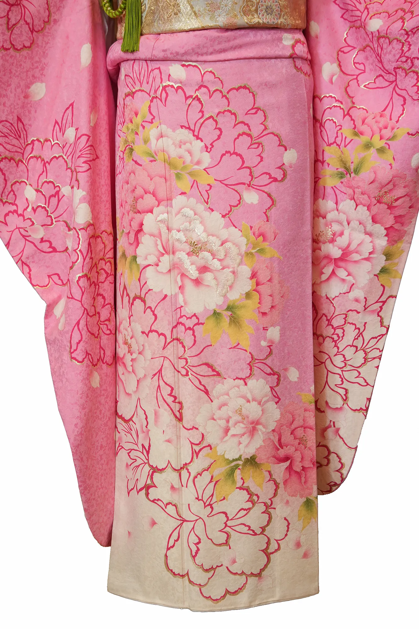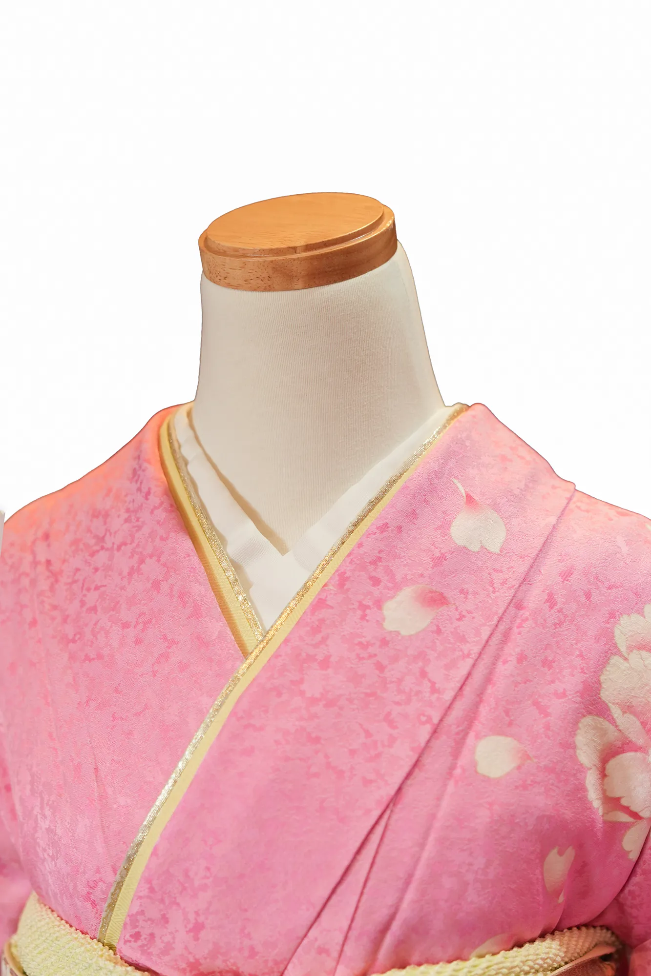 振袖は、長く流れるような袖を持つ着物で、若い女性にとって最も華やかな装いとされています。柔らかく上質な絹地に、手描きや手刺繍の文様が施され、細部に至るまで華やかで魅力的な印象を与えます。振袖は成人式などの大切な場面で着用されることが多く、袋帯を合わせることで、着物はさらに華やかになり、着る人を日本文化の優雅で優美な美しさで輝かせます。