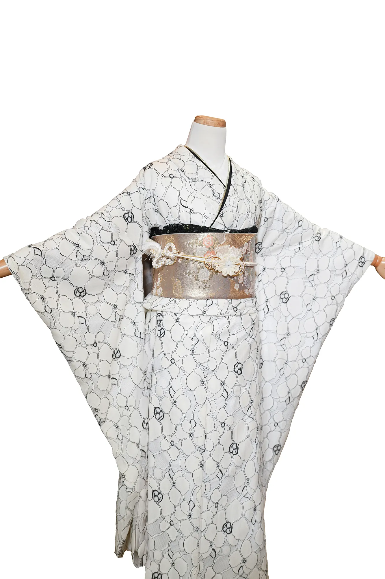 振袖は、長く流れるような袖を持つ着物で、若い女性にとって最も華やかな装いとされています。柔らかく上質な絹地に、手描きや手刺繍の文様が施され、細部に至るまで華やかで魅力的な印象を与えます。振袖は成人式などの大切な場面で着用されることが多く、袋帯を合わせることで、着物はさらに華やかになり、着る人を日本文化の優雅で優美な美しさで輝かせます。