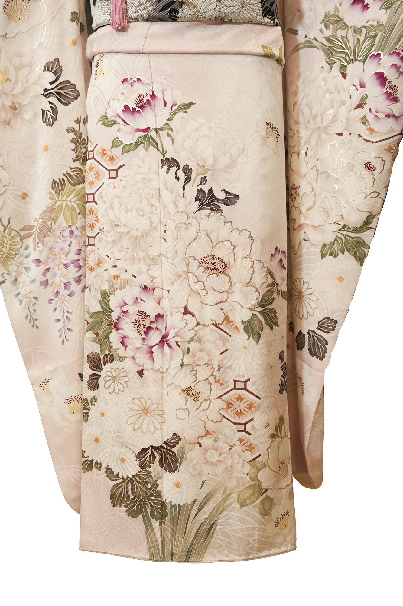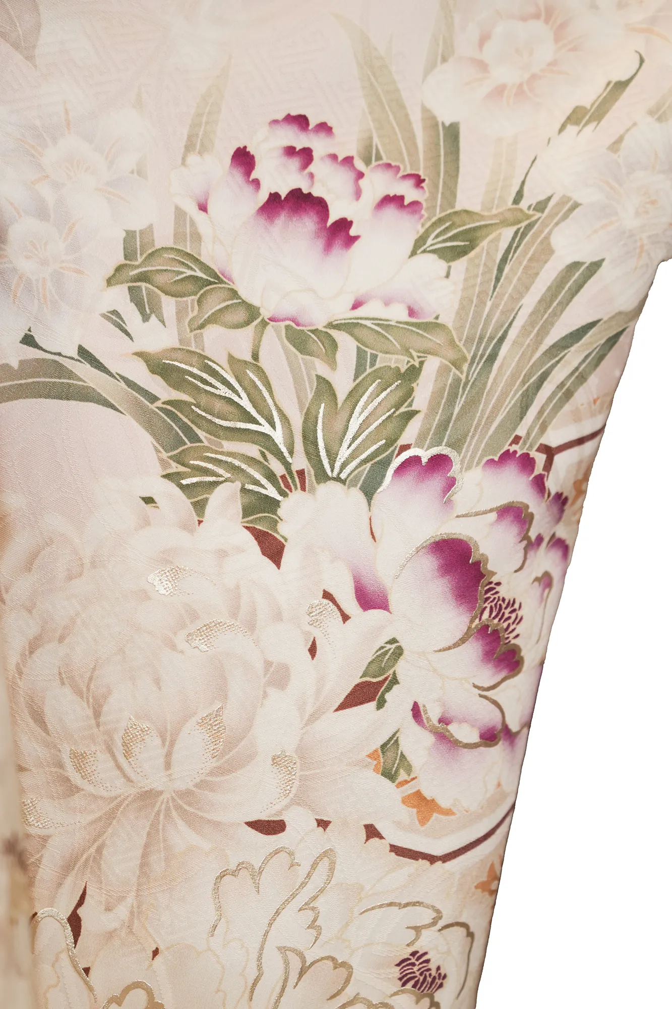 プレミアム振袖は、成人式、結婚式、祝賀会、記念撮影など、フォーマルなシーンに最適な最高級振袖です。厳選された絹を使用し、柔らかな綸子/ジャカード織りの地色に友禅染めの技法と金襴のラメをアクセントにあしらったプレミアム振袖は、洗練された華やかさと優美さを兼ね備えた職人技の逸品です。