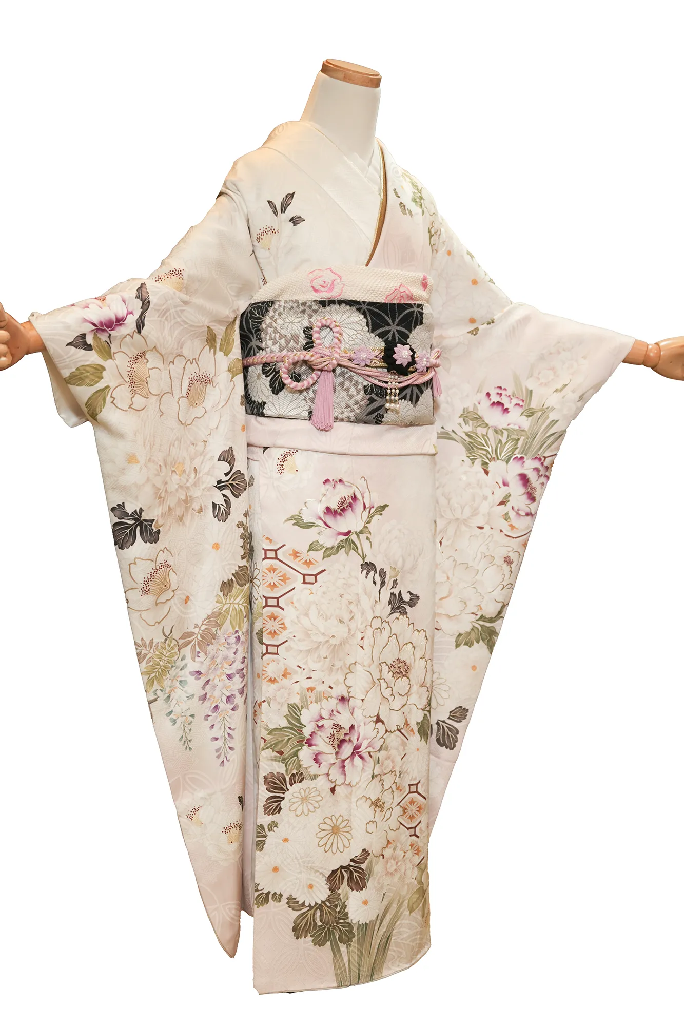 高級な袋帯を合わせ、袋詰やお太鼓などの儀式用の結び方で締め、帯揚げ、帯締め、帯枕、半襟などの小物一式、草履、クラッチバッグを合わせることで、どんなシーンでも映える華やかな装いが完成します。Kimono Kilalaでは、プレミアム振袖の着付けを承り、あらゆるサイズをご用意。着付けサービスと専門の小物相談で、高貴なスタイルと日本の文化を体現するお手伝いをいたします。