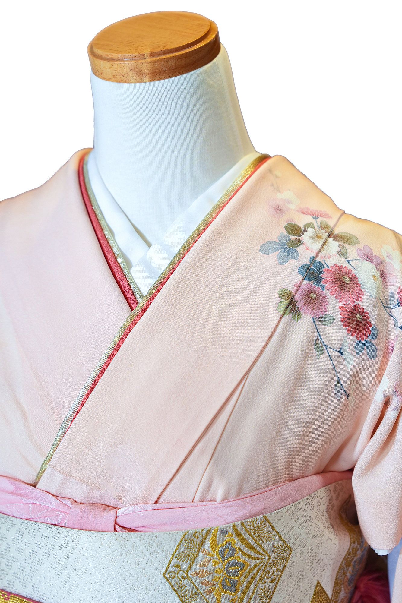 この衣装には、正統派で優雅な雰囲気を象徴する「太鼓結び」と呼ばれる袋帯が合わせられます。訪問着を着ると、高級感と気品が漂います。