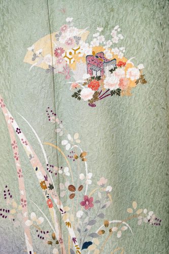 訪问着搭配袋帯(Fukuro obi),袋帯以太鼓结(Taiko style)系法系紧——一种平衡的正方形,象征着正式与优雅。穿着訪问着,尽显奢华与高贵。